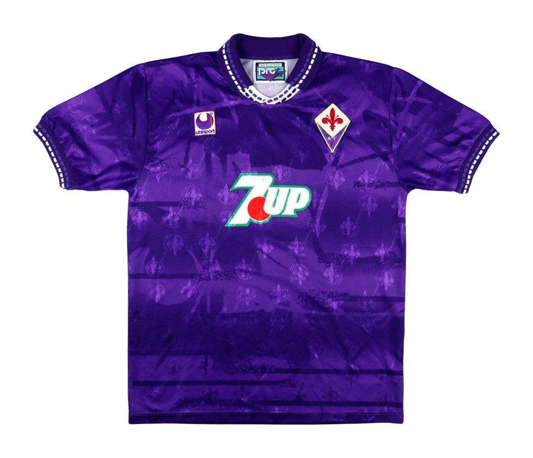 Stagione nerissima per i viola che retrocedono per la prima volta in Serie B dopo ben cinquantaquattro anni. Questo però non è un motivo sufficiente per infangare il ricordo di un capolavoro come questa maglia. L’eleganza delle posizioni precedenti è messa in secondo piano per fare spazio ad un viola decisamente più acceso e ad una grafica particolarissima, con i dettagli a forma dello sponsor tecnico Lotto in pieno stile anni 90. Il colletto a polo e le maniche presentano dettagli bianchi e viola di diverse tonalità ed insieme allo storico sponsor 7up rende questa maglia indimenticabile.
