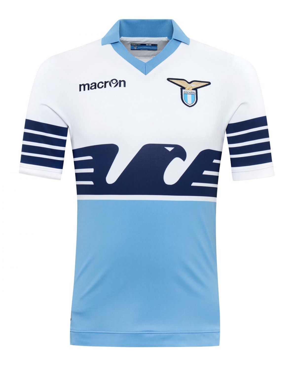 Anche questa volta, Macron si ispira ad un design passato per modernizzarlo. Tipico degli anni 80, torna sulle maglie biancocelesti quasi 30 anni dopo. L’Aquila blu scuro in mezzo alla divisa che separa la parte superiore bianca da quella inferiore azzurra è un tocco di classe non indifferente che piace a tutti, tifosi e non. Il colletto azzurro e le ali dell’aquila che si estendono sulle maniche rendono il design più “vivo” e la mancanza di sponsor garantisce la possibilità di mostrare nel migliore modo possibile.